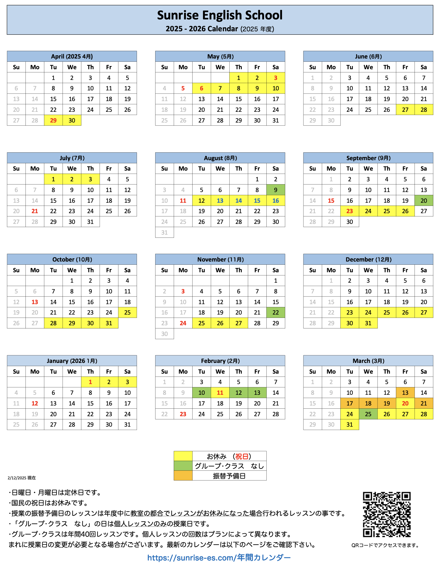年間カレンダー 2025年度 (2025-2026) カレンダー 2025年4月1日レッスン開始 共有: クリックして X で共有 (新しいウィンドウで開きます) X Facebook で共有するにはクリックしてください (新しいウィンドウで開きます) Facebook いいね 読み込み中…