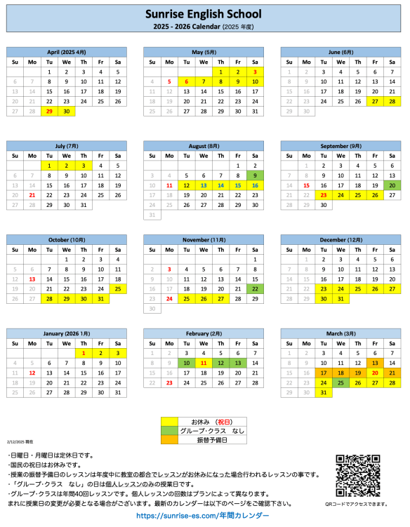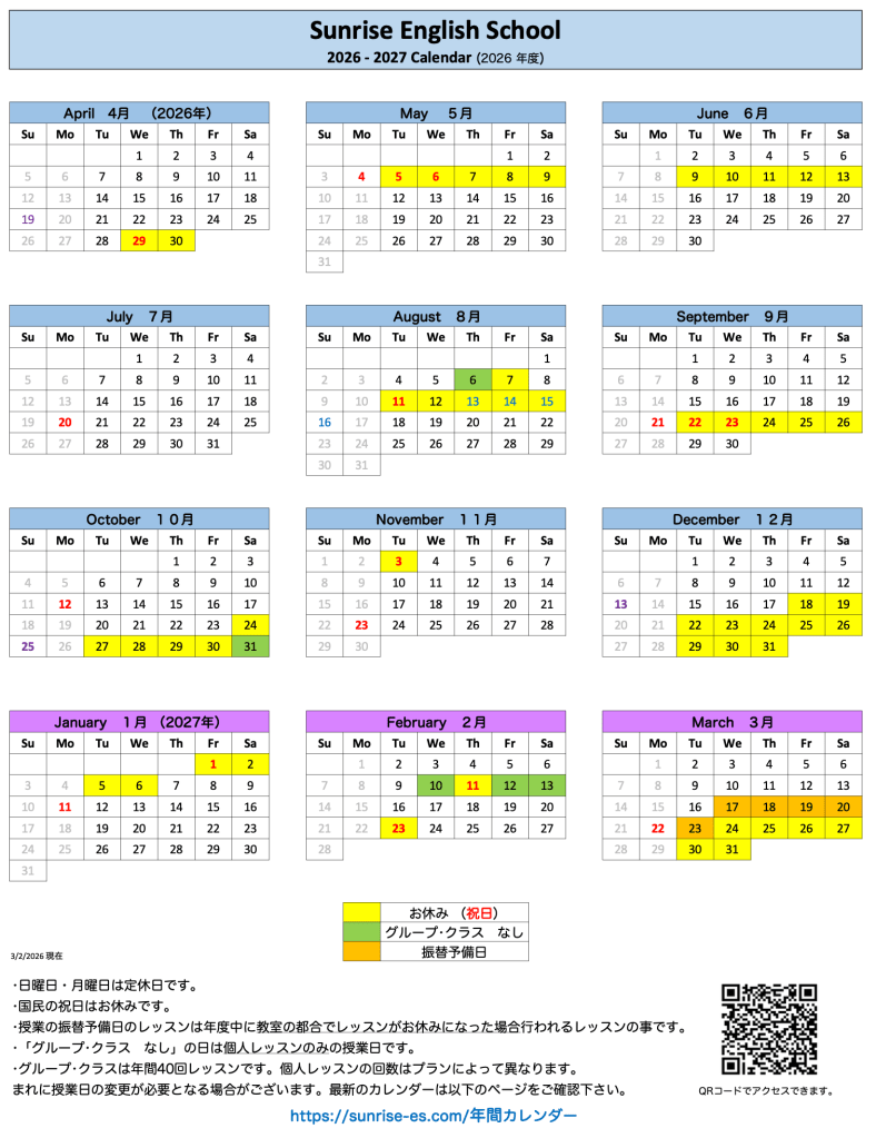 サンライズ英語教室 年間カレンダー