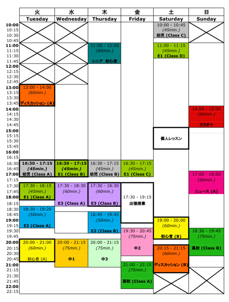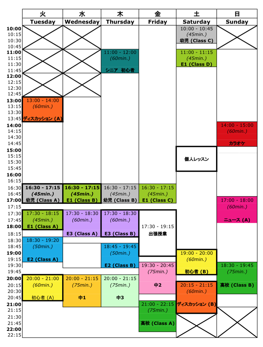 E2 クラス C (金曜日 18:00 – 19:00)